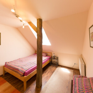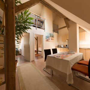 Während Ihres Aufenthaltes hier wohnen Sie in unserem Gästeappartement Raum der Ruhe. Es verfügt über insgesamt ca. 63 großzügige Quadratmeter, die sich über zwei Ebenen verteilen. Das Appartement mit seinem separaten Eingang liegt im ersten Obergeschoß und ist über eine Außen-Wendeltreppe zu erreichen.