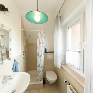 Das kleine Badezimmer ist mit Toilette, Dusche und Waschbecken ausgestattet. Ein Föhn ist vorhanden. Hand-, Bade- und Saunatücher liegen für Sie bereit.
